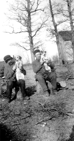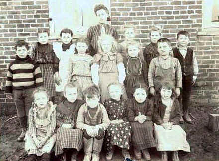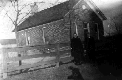 Brown School teacher (unknown) outside school with students; it was torn down in the summer of 1930 to make way for the new SRS. But the little hand-pump on the corner remained for decades. |