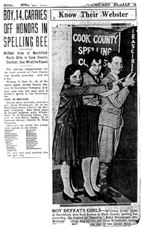 Brown school student William Cray wins Annual Cook County Spelling Bee soon after his father becomes principal; article from Chicago Herald, April, 1930 |