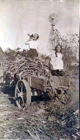 Young woman posing on wagon hoisting jug; on back of photo: "Henrietta, I was taking in a bushel Basket on a wagon and they had worst time dumping me out. So they call me 'tub a Lard.' " |