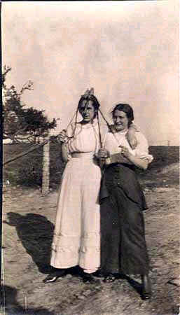 Two women posing in meadow with cornshucks; "Heniretta, my hair braided in cornshucks - Henrietta, send me some cornshucks if you have some" |