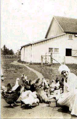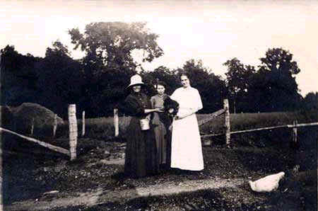 Aunt Gustie and Barb and another woman standing on farm holding chickens |