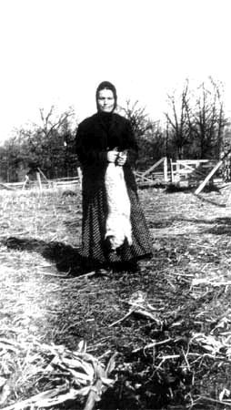 Jetta Nadir, longtime Northfield resident, holding pig on her farm |