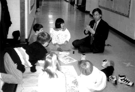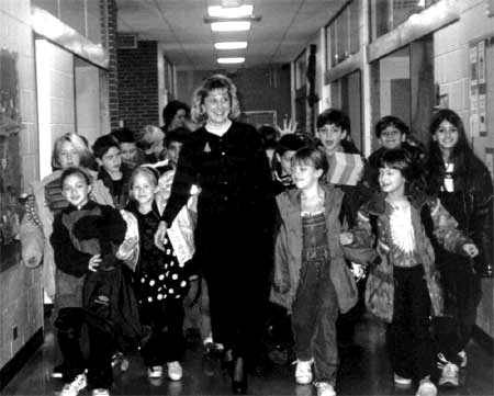 Middlefork Principal Linda Vieth (1990-2000) with students in hall |