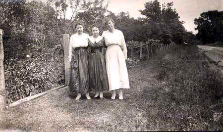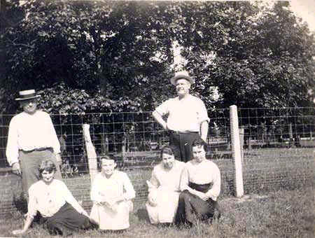 Meyer, Tina, Gustie, Helen standing near fence in meadow |