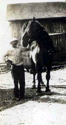 Henry (Hank) Brachtendorf with horse in front of wooden building |