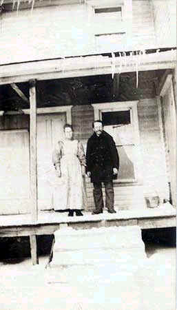 Man and woman standing on porch of house in winter |