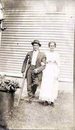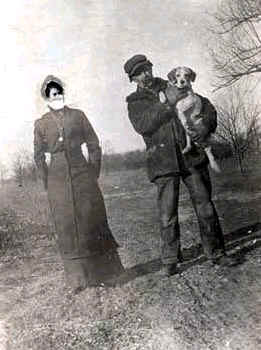 John Brown and unknown woman standing in field; man holding a dog. In 1878 Brown donated the land for the first Northfield school. It opened in 1892. |