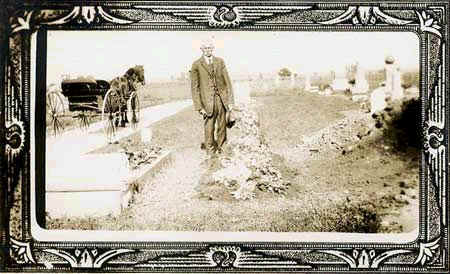 Happ family member in cemetery; horse and buggy on side; postcard format |