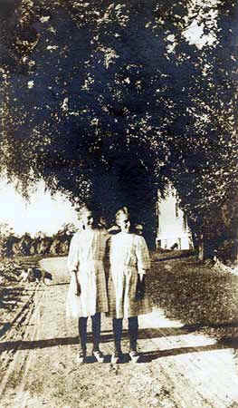Lilly and Helen Efflandt in plaid dresses standing near farmhouse |