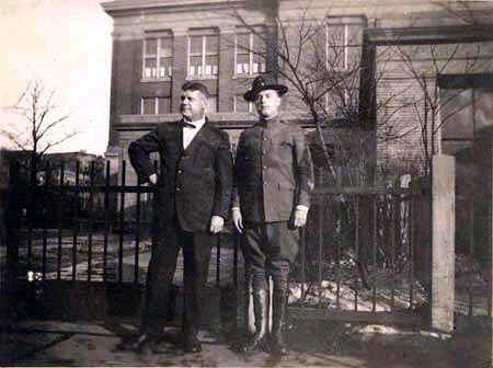 Unknown man and solider in WWI uniform in front of iron fence; multi-story building in background |