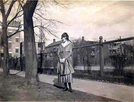 Unknown woman standing on sidewalk; wearing a day-time dress; probable location Chicago |