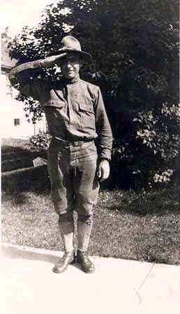 Man in WWI uniform, Allen Gerken, saluting. "Henrietta" on back of photo |