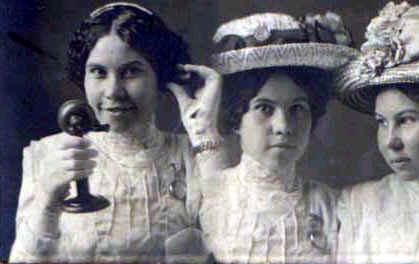 Three girls - possible first names, Lena and Gustie - wearing hats and with telephone |