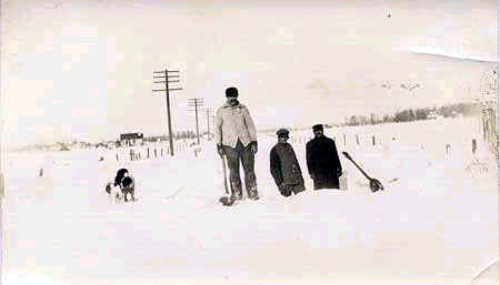 Three men shoveling snow with dogs playing; Electric poles in background |