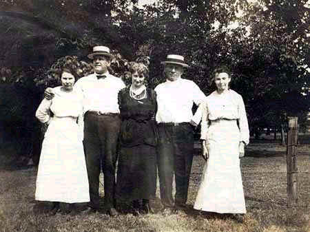 Three women and two men; men in straw boaters, women in long skirts |