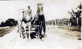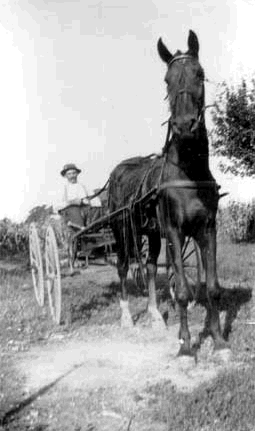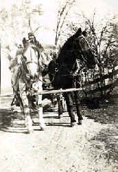 Horse-drawn wagon on Kotz road, named after farmer Charles Kotz. The road was renamed "Sunset Ridge" road in the '20s; dirt roads first built in early 1900s, remained unpaved for twenty-five years. |