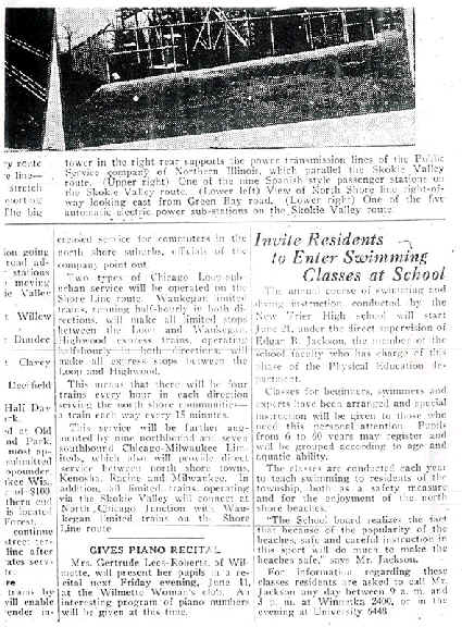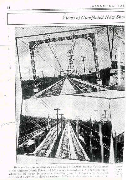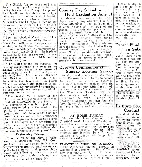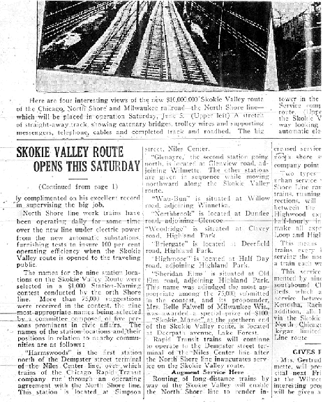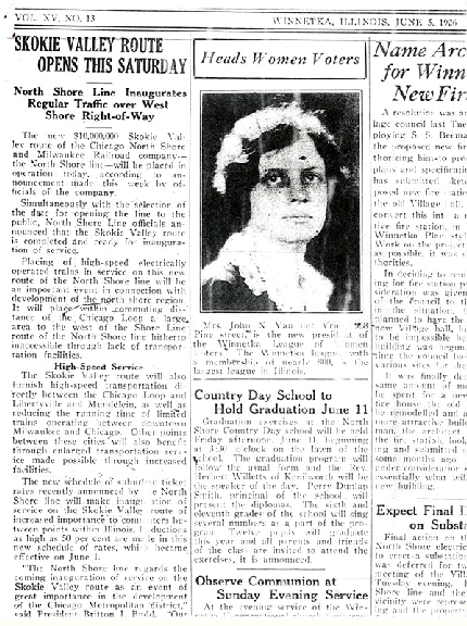 Skokie Valley Train line opens; announcement in Winnetka Talk about new Chicago North Shore and Milwaukee Railroad route |